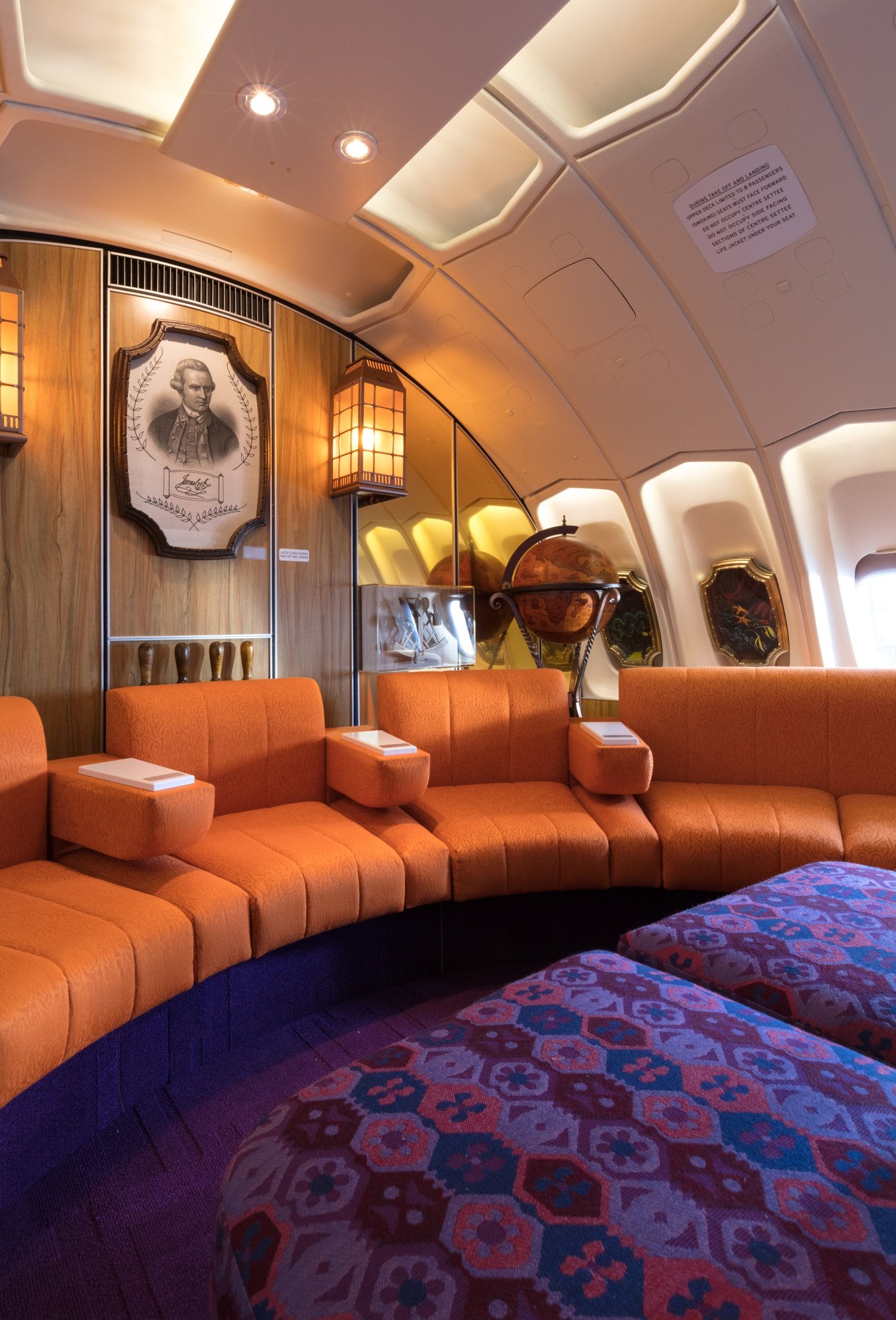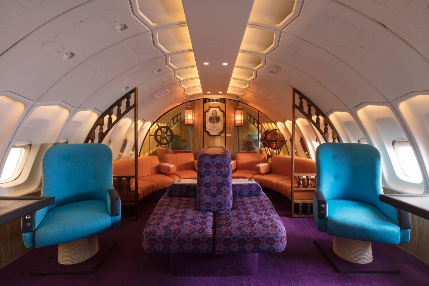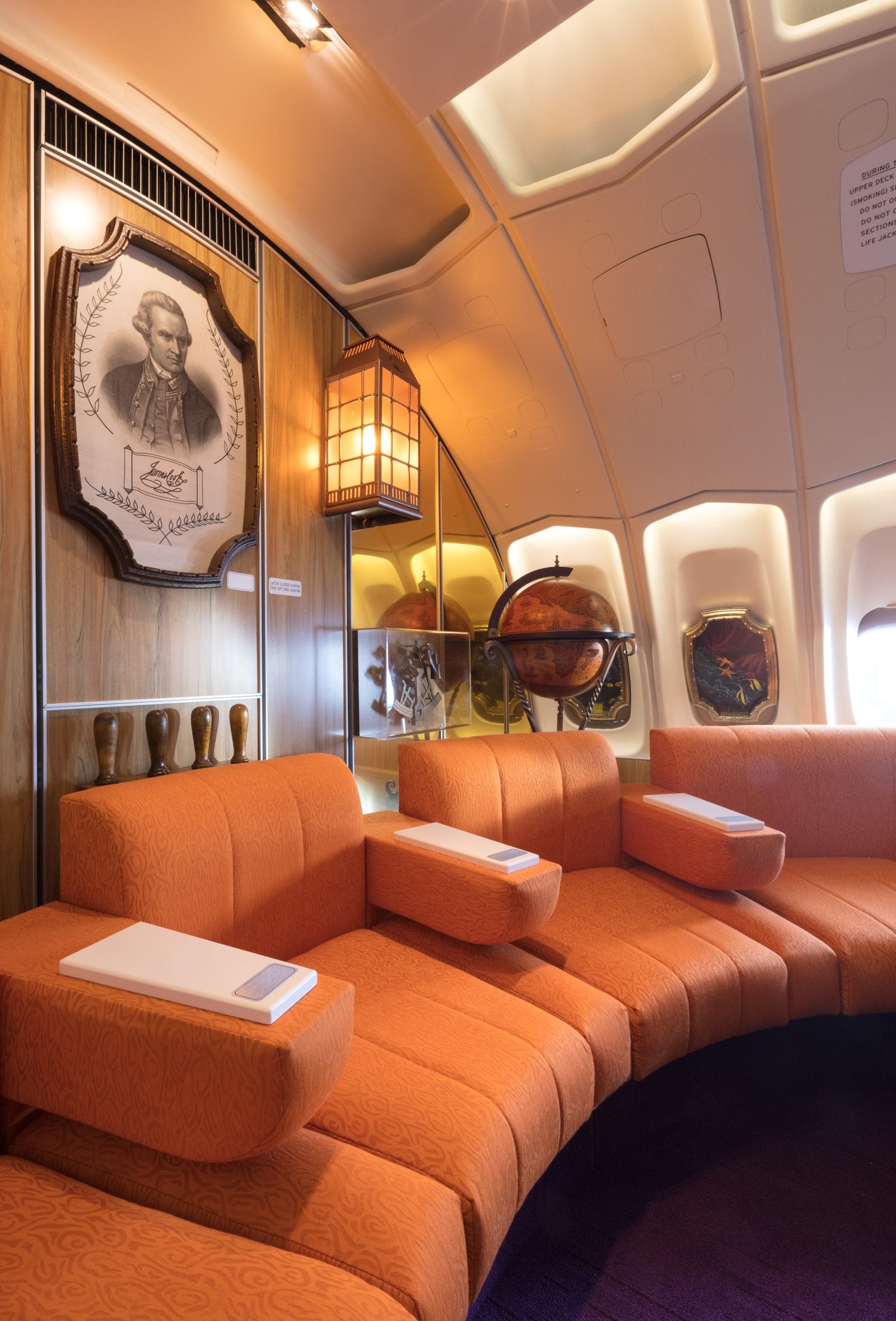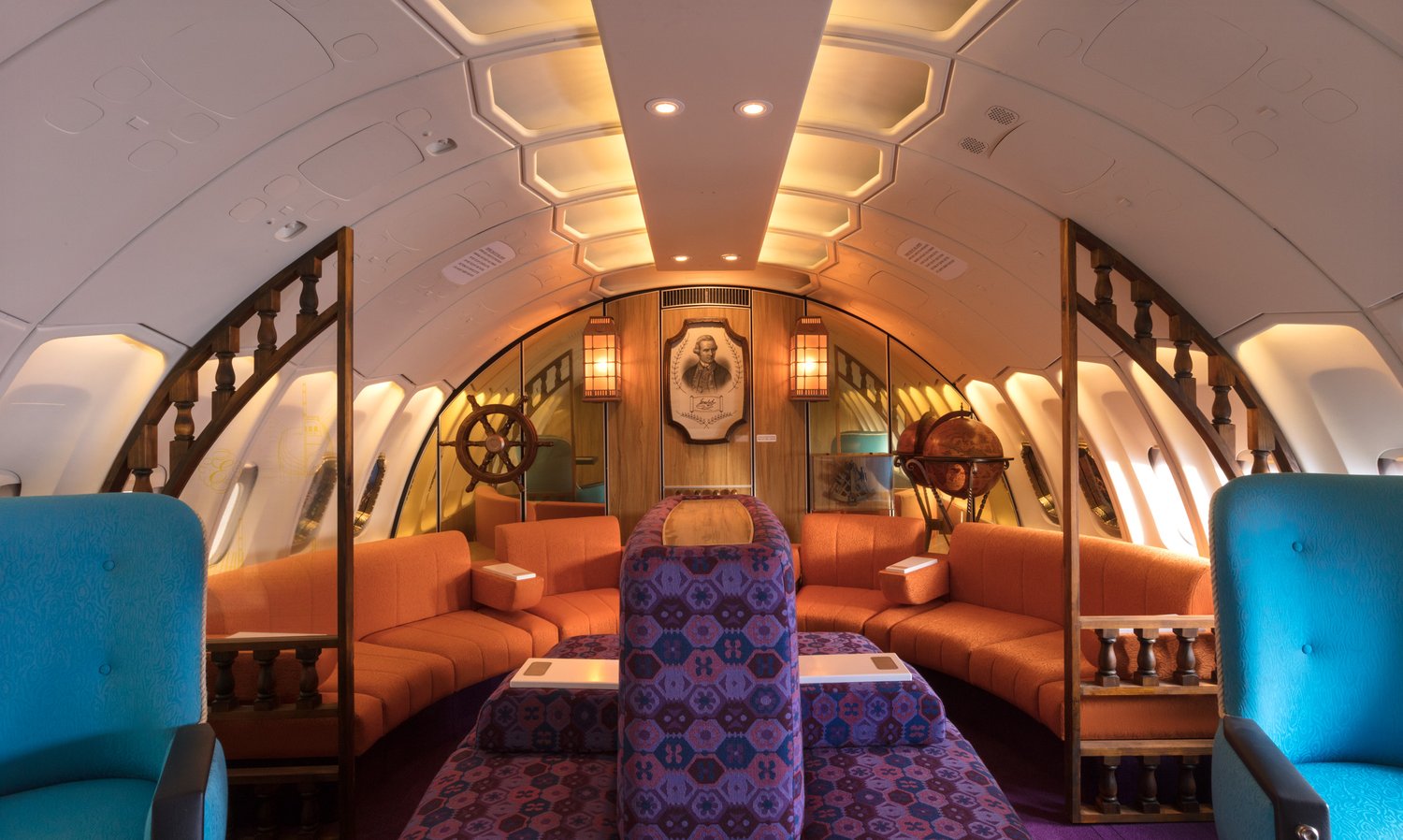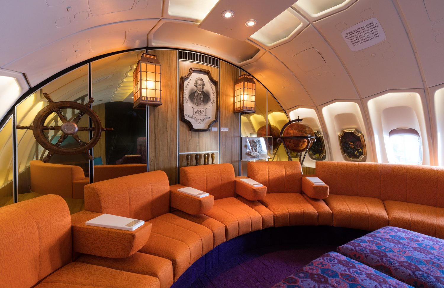 A custom-made replica of the iconic 1970s Qantas Boeing 747-200 First Class inflight lounge for an installation at the Qantas Founders Museum in Longreach.