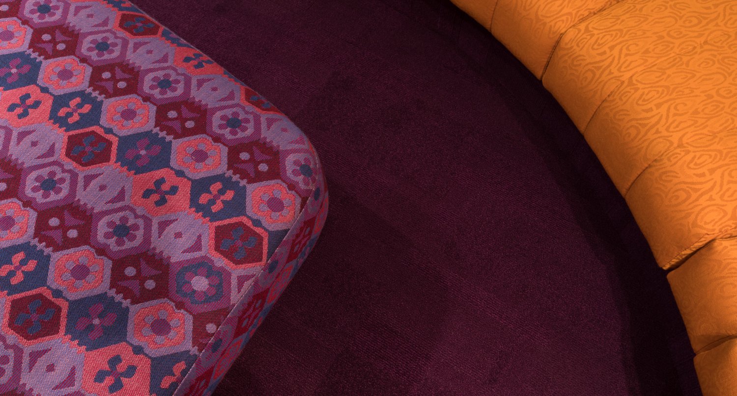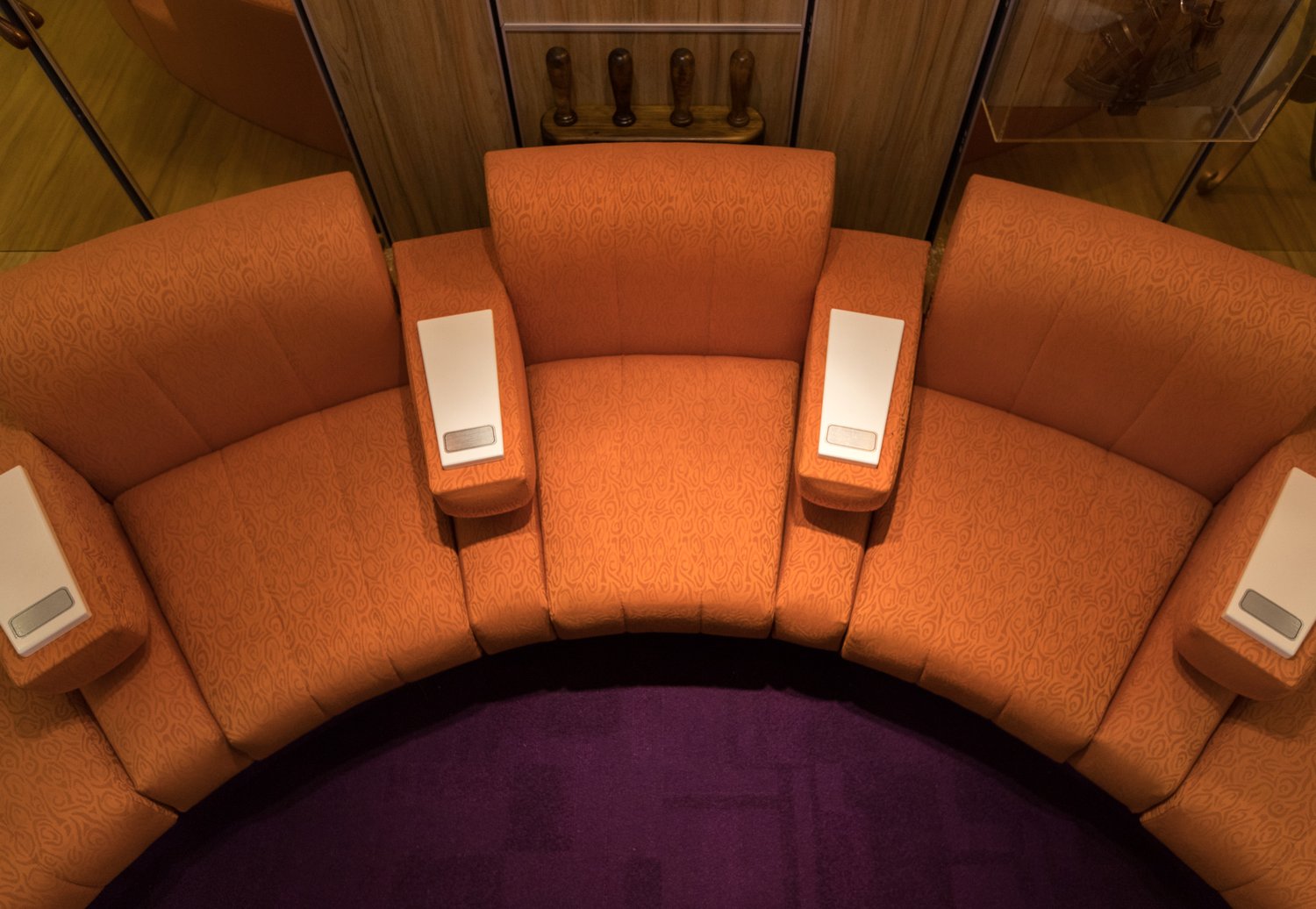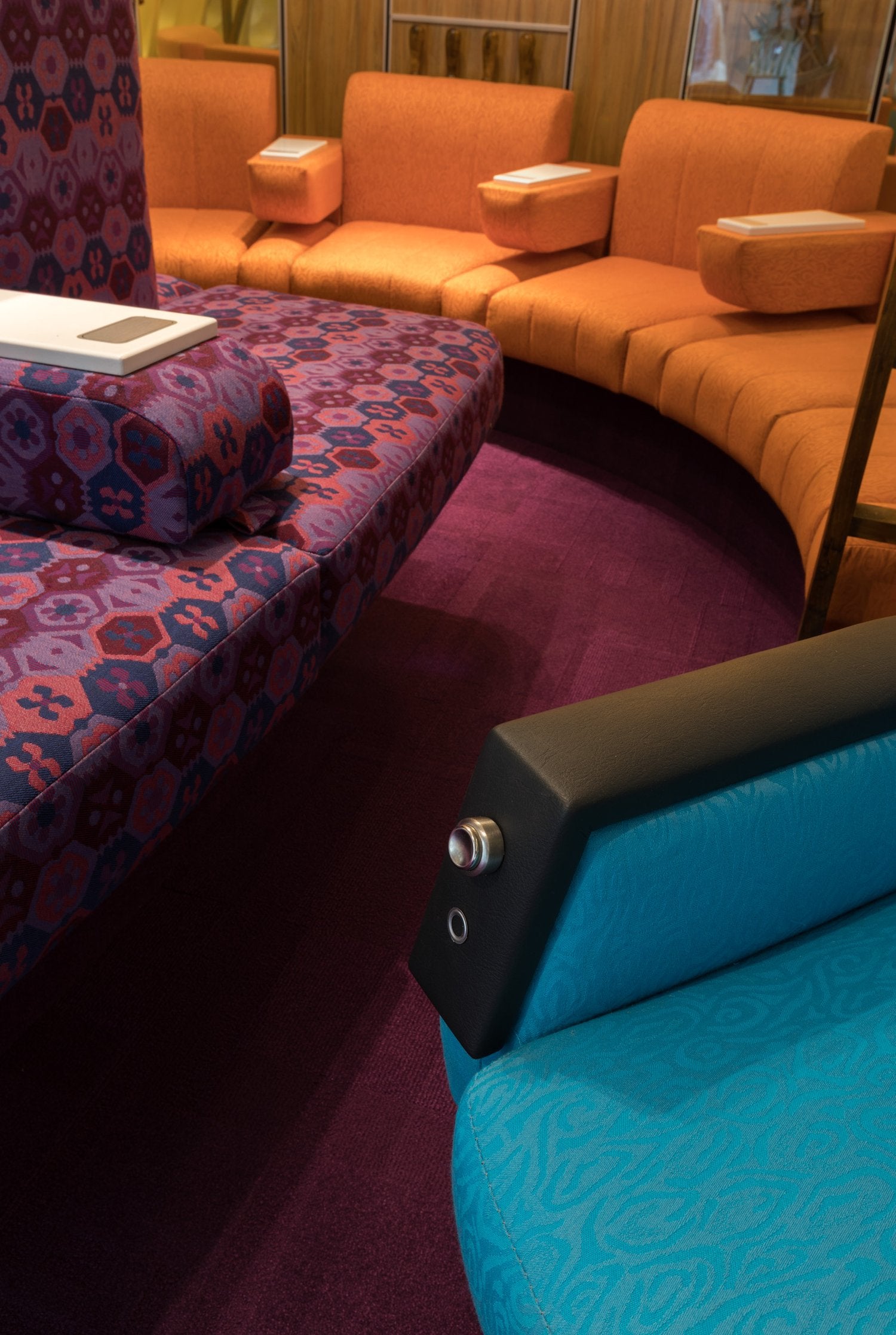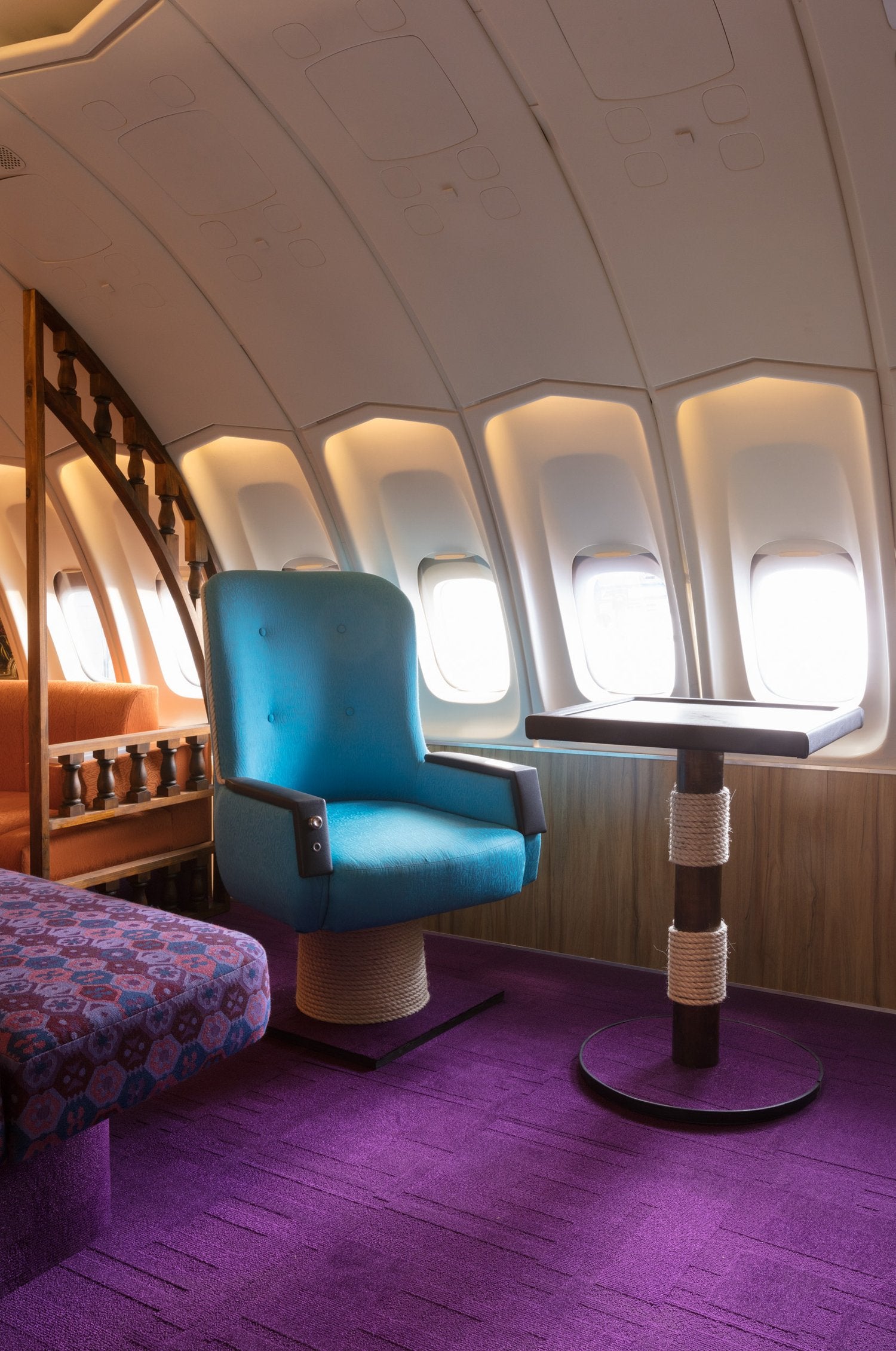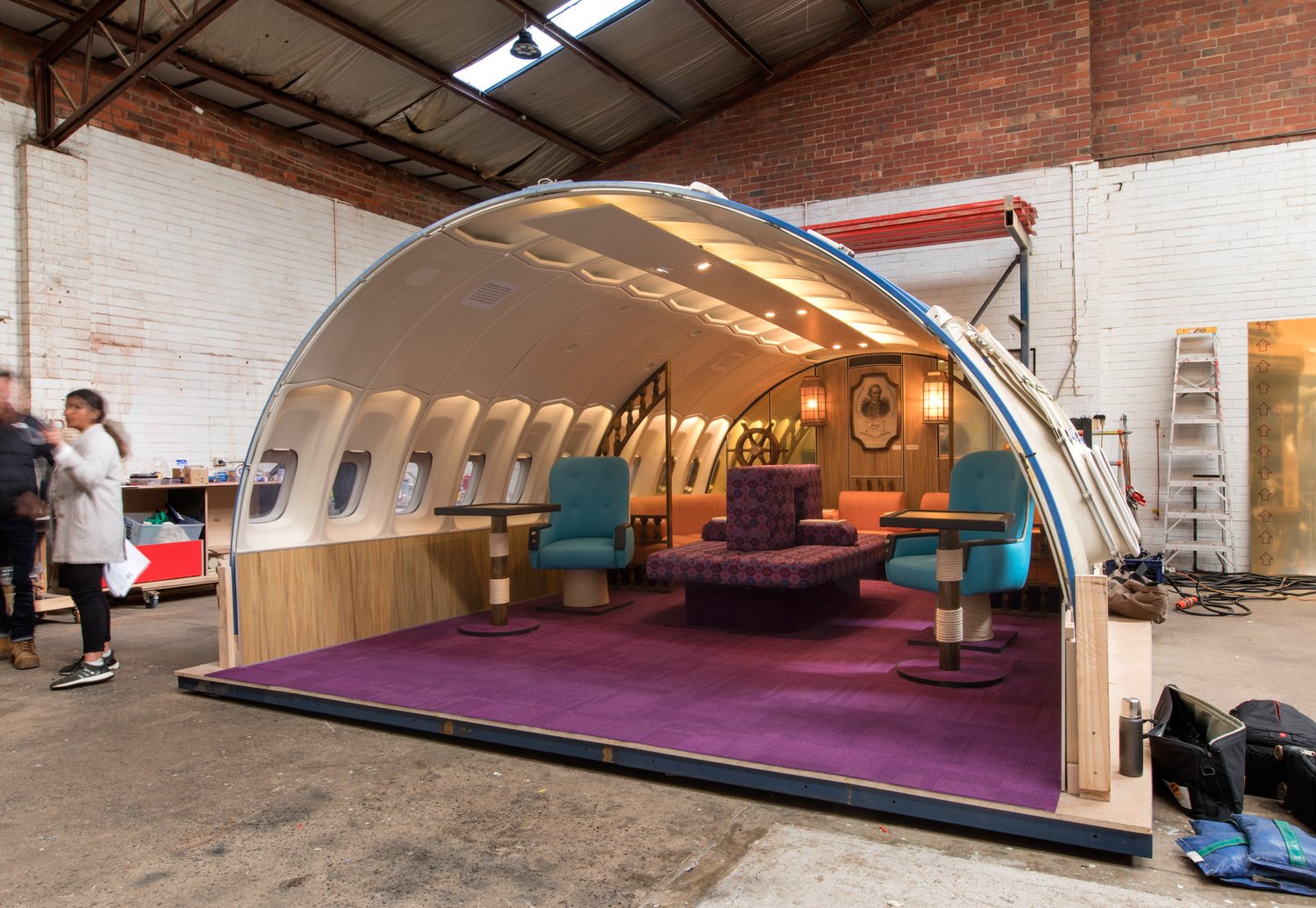 A custom-made replica of the iconic 1970s Qantas Boeing 747-200 First Class inflight lounge for an installation at the Qantas Founders Museum in Longreach.